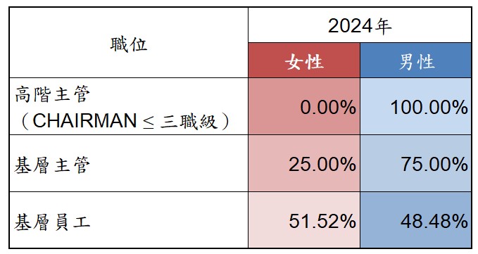員工結構 敦吉於人員招募上,依循公司政策及相關法令規定,除秉持公平客觀之精神,評估求職者之綜合表現外,並重視人才選任多元性原則並兼顧性別平等議題,確保就業機會平等。 在勞動權益(例如:薪酬福利、培訓機會、升遷等)事項上,確保員工不會因種族、性別、宗教信仰、年齡、政治傾向及其他受適用法規保護的任何其他狀況而有不公平的對待。